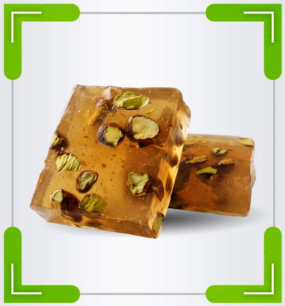 راحة بشكلها المربع محشية بالفستق الحلبي ، و مضاف إليها المستكة لتضفي عليها طعم رائع . و تقدم في العديد من المناسبات أو تقدم مع فنجان من القهوة أو الشاي .