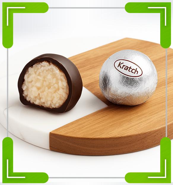 Coconut Balls Round-shaped balls made of sweetened coconut, dipped in delicious chocolate and wrapped in silver color to suit any occasions.