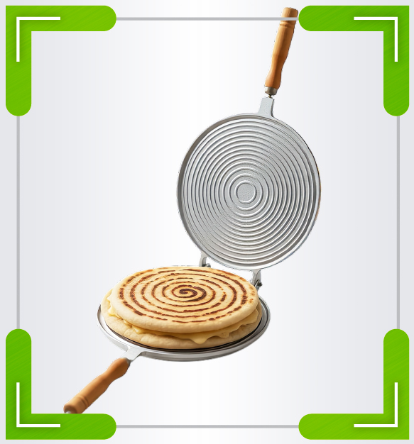 A unique traditional hand toaster, used to warm food, typically placed on fire or coals, infusing sandwiches with a delicious, toasted flavor