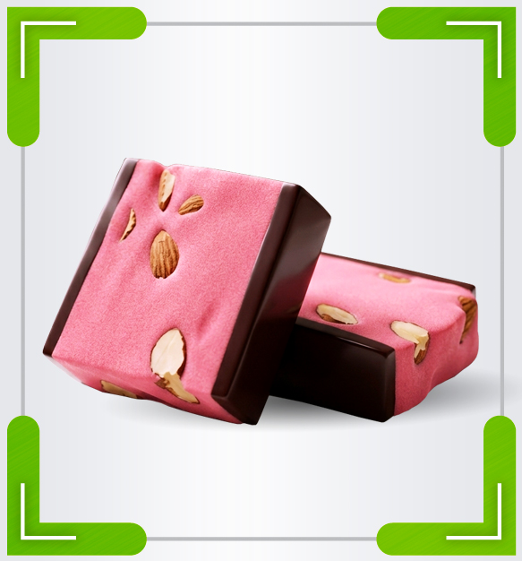 Nougat filled with roasted almond is covered in a layer of Strawberry on either side to create a tasteful piece. The combination of colours which are white, brown, and Pink give the nougat a great taste. The nougat is served on special occasion and can be enjoyed while having coffee and tea.
